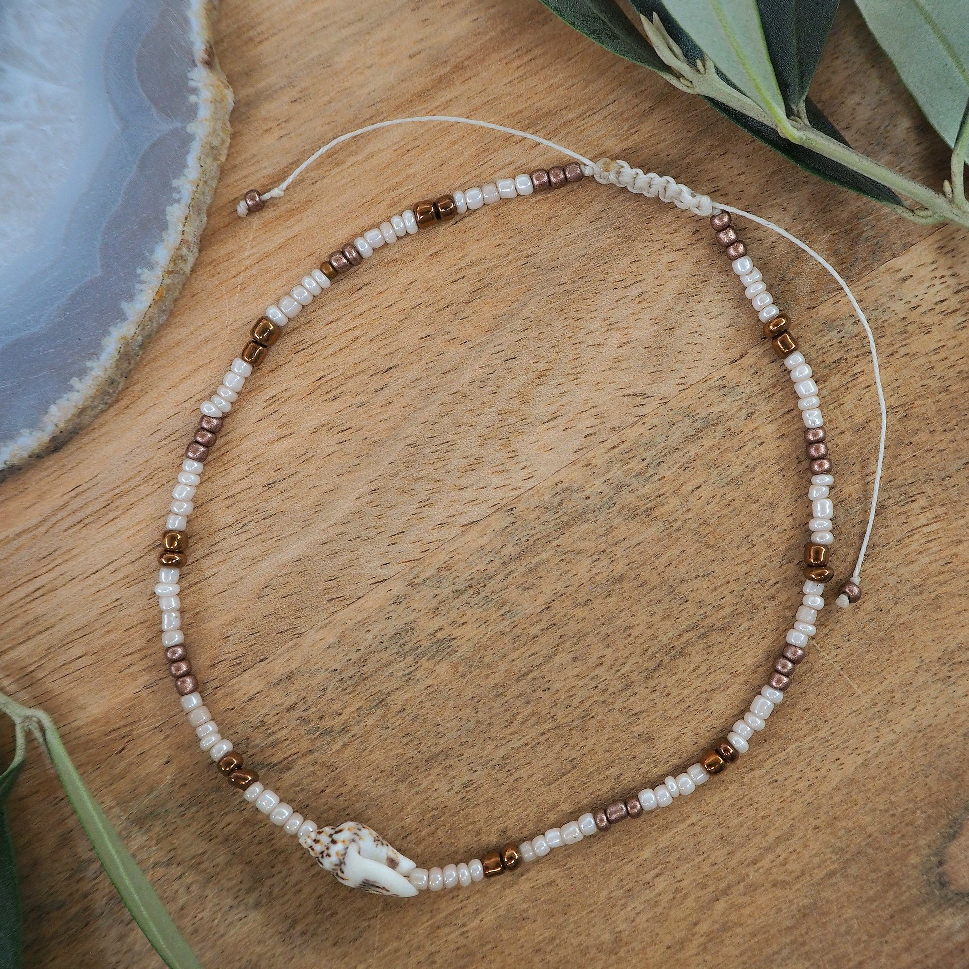Das Steinarmband „Alba“ kombiniert die Reinheit von Weiß mit der Authentizität von Bronze und erinnert an natürliche Schönheit und Ausgewogenheit.